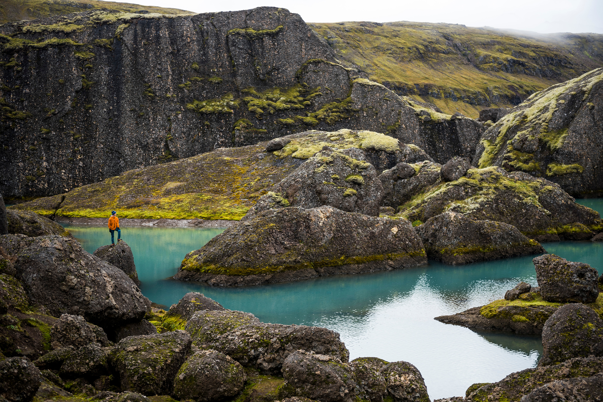 Climb to bright blue ponds surrounded by house-sized boulders at Stórurð.