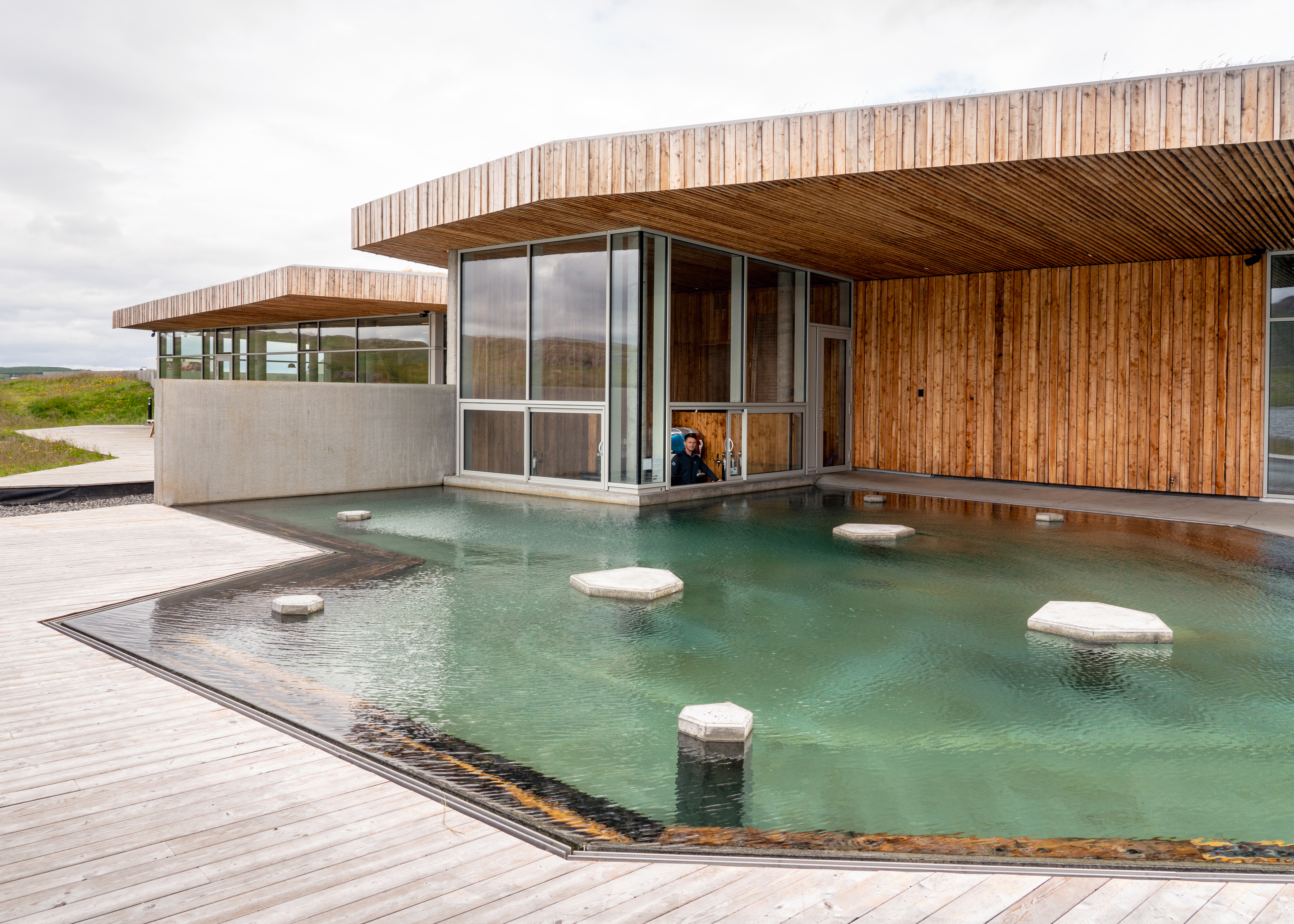 The most striking feature of Vök Baths in Iceland is undoubtedly the floating pools. These hexagonal structures sit directly on the lake's surface, connected to the shore by a wooden walkway. As you soak in the 39°C (102°F) water, the lake ripples just inches away from the edge of the pool.