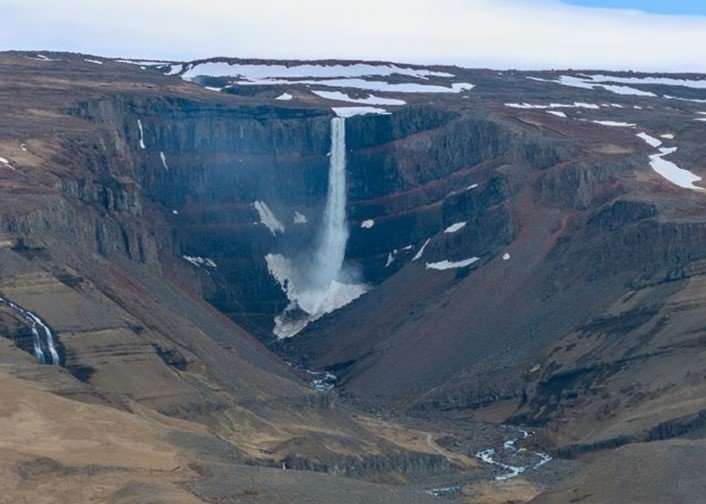 Hengifoss waterfall in Fljótsdalur is one of the best-known destinations in East Iceland. It is the third highest waterfall in the country, majestically standing at about 128 meters high. The Hengifoss River boasts a beautiful series of waterfalls, with Hengifoss being the most prominent. The brink of the waterfall is about 450 meters high in the hillside, and it stands out against the sky from the valley below. The waterfall plunges into a dramatic but beautiful gorge that forms a large bowl in the hillside. The gorge walls are basalt columns with notable red layers between the basalt layers. Beneath the waterfall are thick sedimentary layers formed 5 to 6 million years ago. At the top of these layers is lignite, remnants of a large forest, where pieces of tree trunks and roots are occasionally visible, pressed together by the weight of the earth. Basalt lava flowed over the forest in this depression, and sedimentary layers later settled on top of it. Two streams, both named Sellækur, flow in waterfalls and rapids down into the gorge. In the gorge are large and picturesque piles of rocks that have broken off from the sedimentary layers.