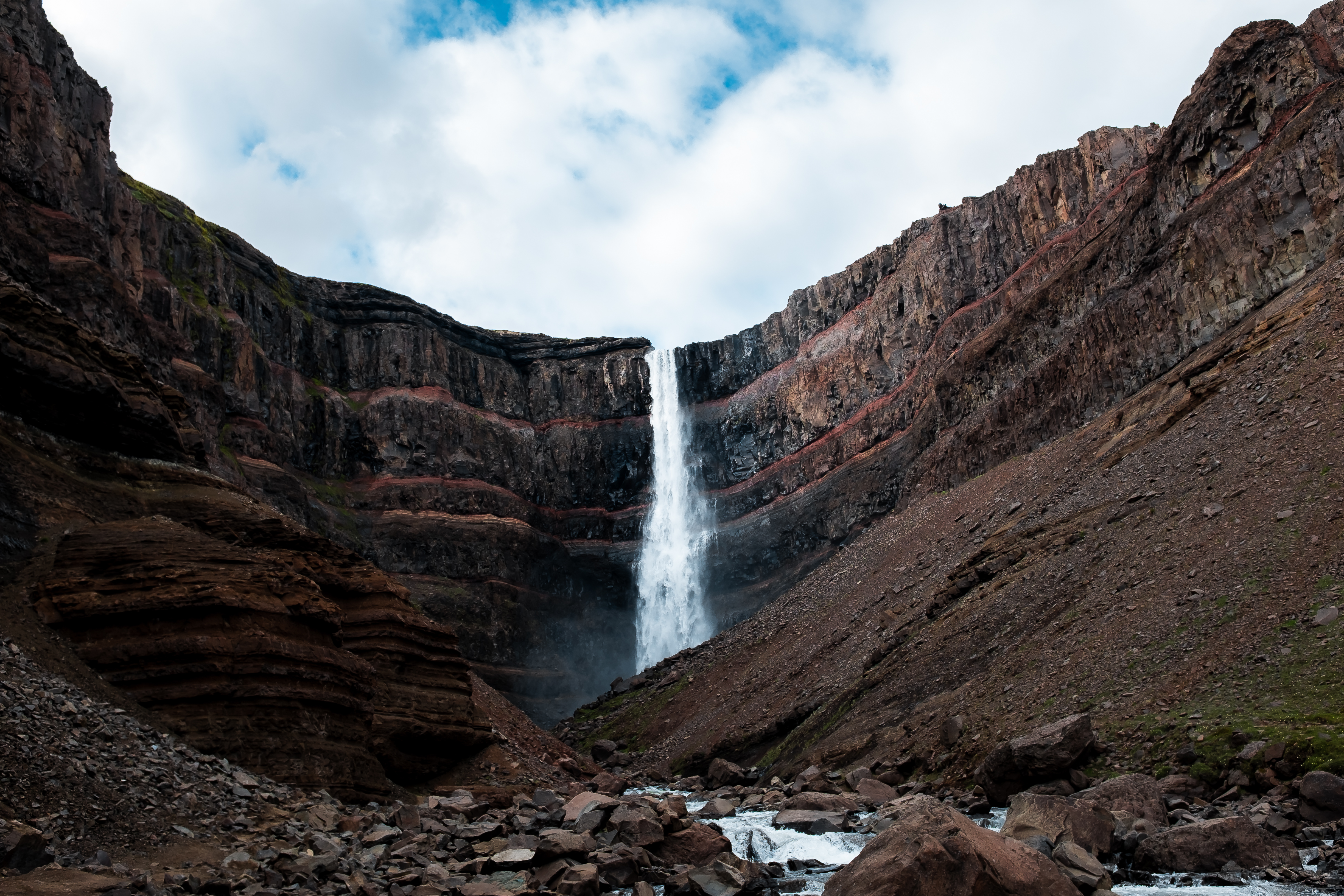 Usually, the climb ends well below Hengifoss, at a point where it can easily be admired without crossing the river. However, if the flow is scarce - as is often the case in autumn - it is feasible to go closer and even enter a shallow cave behind the waterfall.