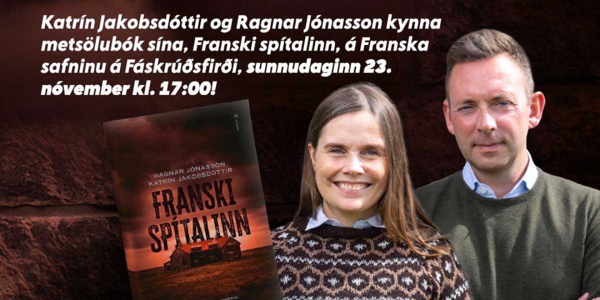 Katrín Jakobsdóttir og Ragnar Jónasson lesa upp úr nýrri metsölubók sinni — Franska spítalanum — á Franska safninu á Fáskrúðsfirði sunnudaginn 23. nóvember kl. 17:00.